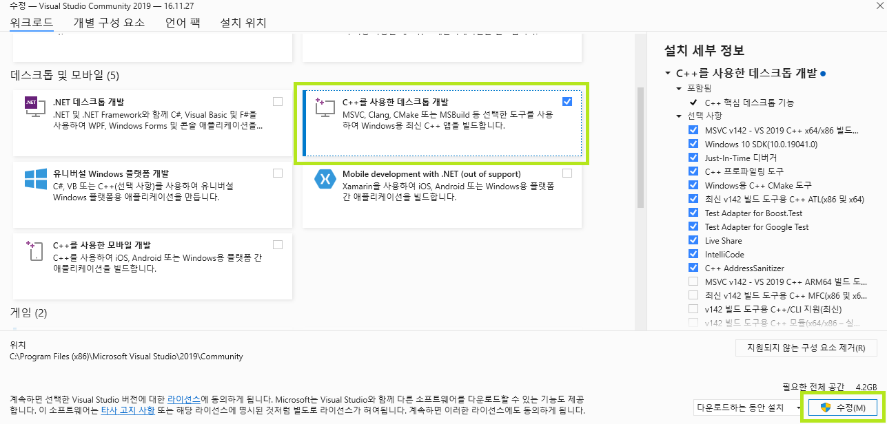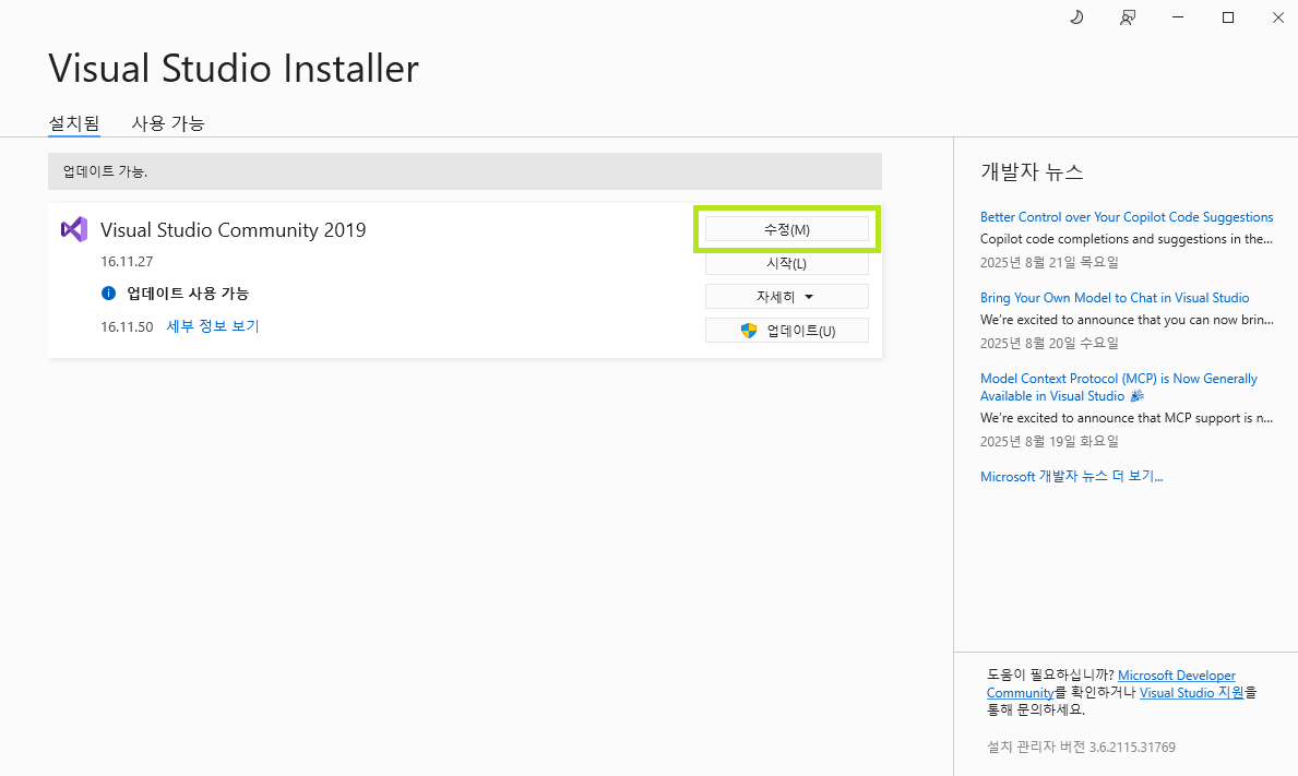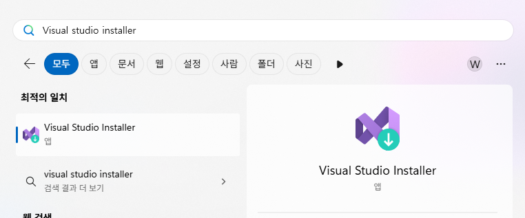์ด๋ฏธ ์ค์น๊ฐ ๋์ด์๋ค๋ฉด Visual Studio Installer ํ์ผ์ ์คํ์ํค๊ณ ,