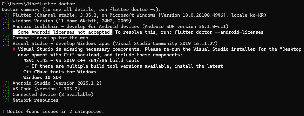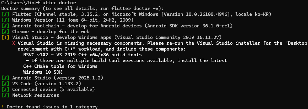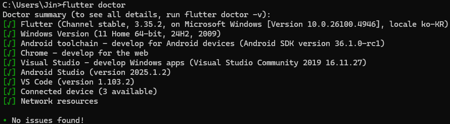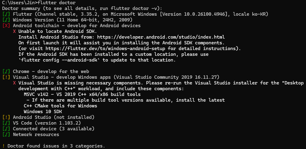 flutter doctor๋ Flutter ๊ฐ๋ฐ ํ๊ฒฝ์ ๋ชจ๋ ๊ตฌ์ฑ ์์๊ฐ ์ฌ๋ฐ๋ฅธ์ง ํ์ธํ๋ ๋ช ๋ น์ด๋ค.