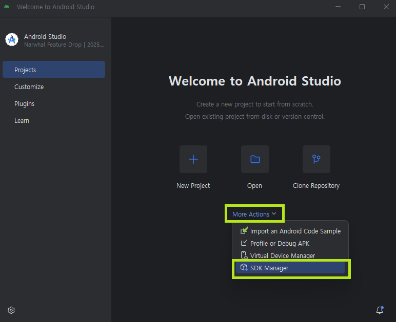 More Action → SDK Manager → SDK Tools → Android SDK Command-line Tools ์ฒดํฌ → Apply → ์ค์น ํ OK ๋ฒํผ ํด๋ฆญ