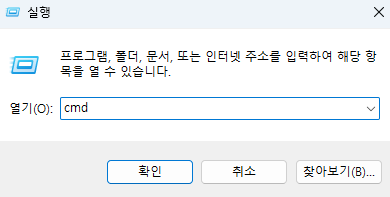 Window+R ํค๋ฅผ ๋๋ฅธ ํ, 'cmd'๋ฅผ ์ ๋ ฅํด์ ์ปค๋งจ๋์ฐฝ์ ์ฐ๋ค.