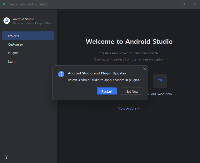 Android Studio ์คํ → Plugins → Flutter, Dart ์ค์น