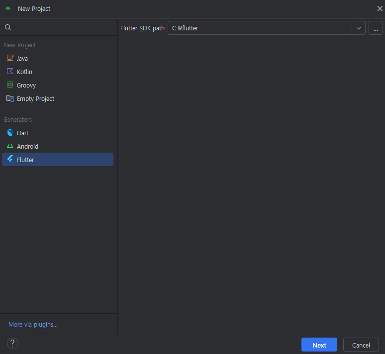 Flutter → ... ๋ฒํผ ํด๋ฆญ ํ SDK ๊ฒฝ๋ก ์ค์ (๋๋ C:\flutter ๊ฒฝ๋ก๋ฅผ ์ ๋ ฅํ๋ค.)