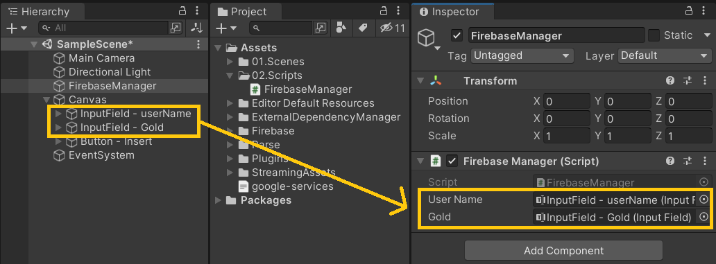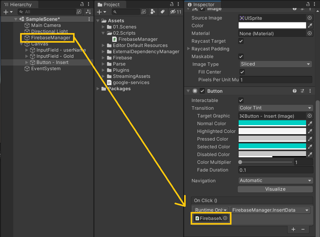 - FirebaseManager ์ค๋ธ์ ํธ ์ฐ๊ฒฐ > InsertData() ํจ์ ์ฐ๊ฒฐ