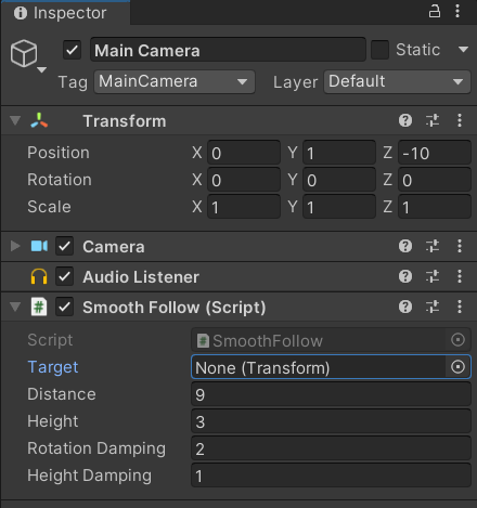 - Distance, Height, Rotation Damping, Height Damping ์ ๋นํ ์กฐ์
