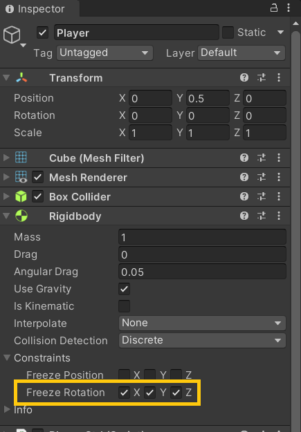 - Player๊ฐ ๋ฌผ์ฒด์ ๋ถ๋ชํ์ ๋ ๋์ด์ง์ง ์๋๋ก Freeze Rotation ์ฒดํฌ