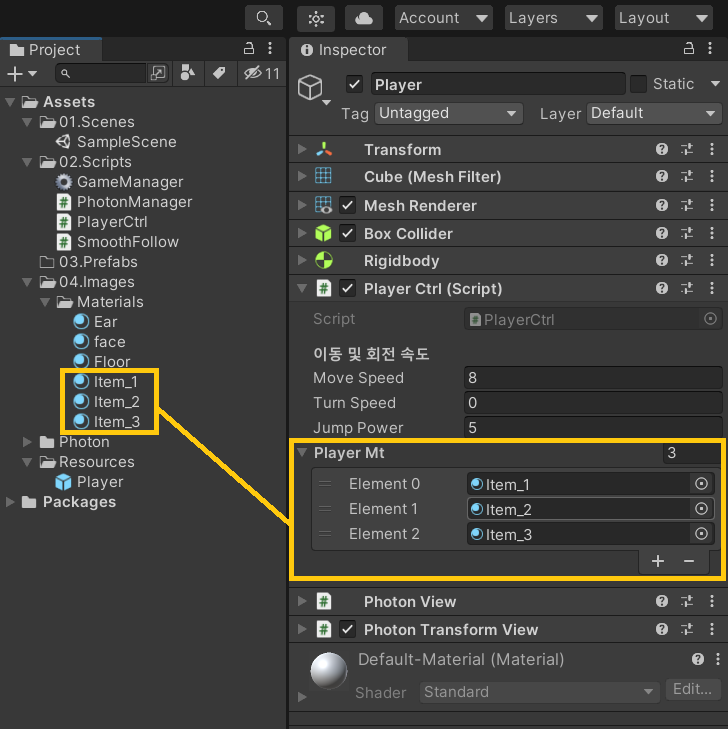 - ํ๋ ์ด์ด Material ๋ฐ๊พธ๊ธฐ