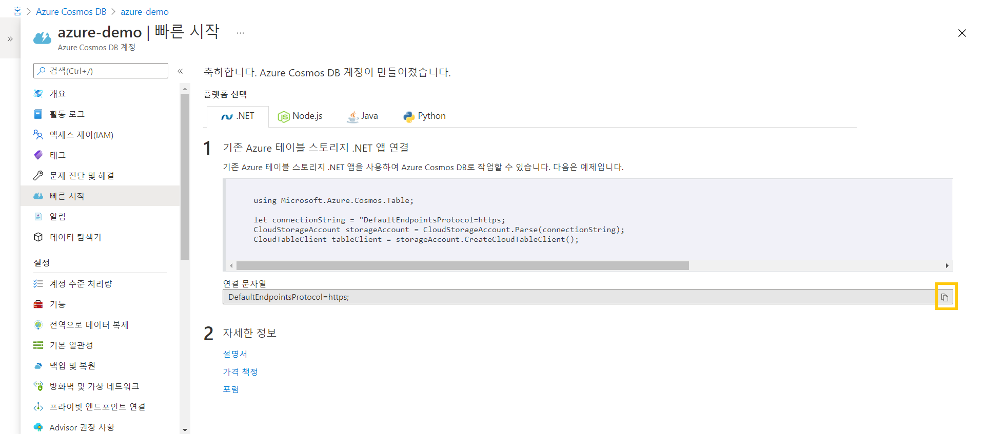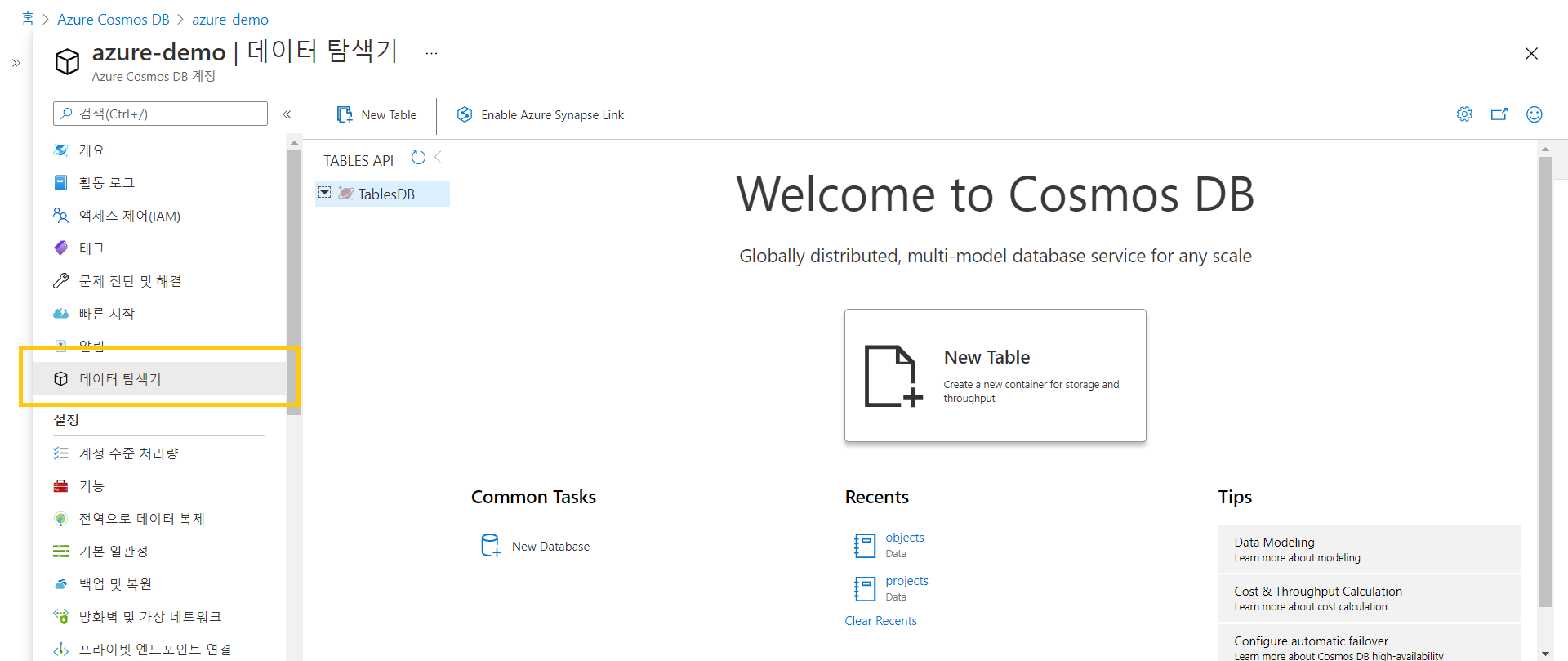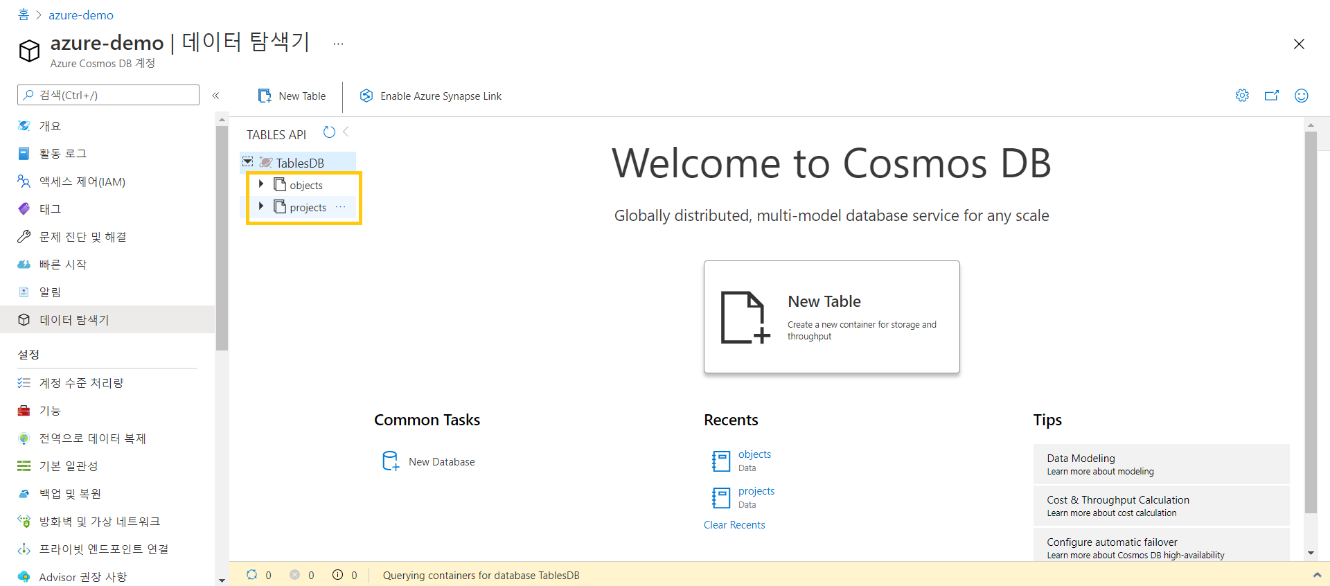 - Table 2๊ฐ๊ฐ ์๊ธด ๊ฒ์ ํ์ธ > Azure Cosmos DB ์ฐ๊ฒฐ๋ ๊ฒ