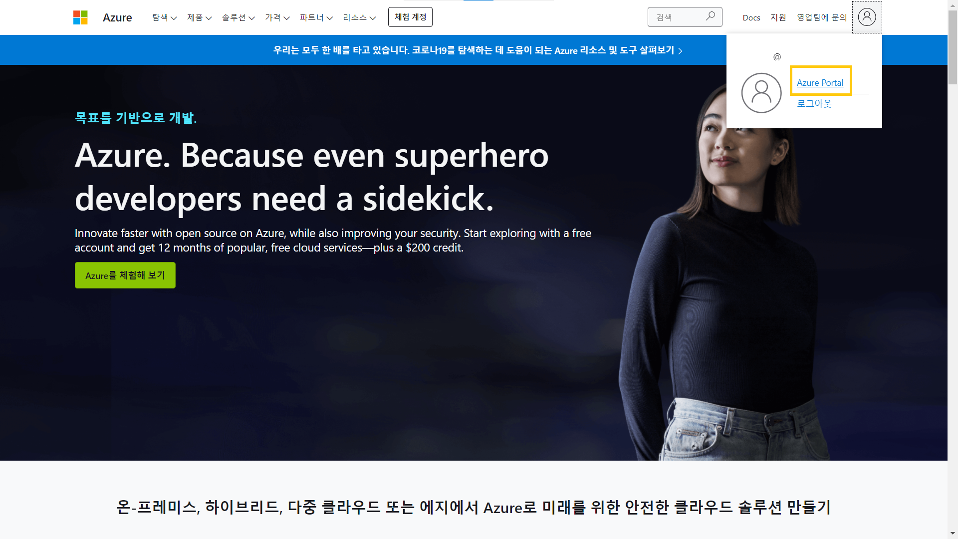 - ์ด๋ฏธ ๊ณ์ ์ด ์๋ ์ํ๋ผ๋ฉด ์ฐ์ธก ์๋จ์ ์๋ ์์ด์ฝ์ ๋๋ฌ Azure Portal ํด๋ฆญ