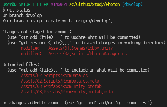 - git status : ํ์ฌ ํ์ผ ์ํ๋ฅผ ํ์ธํ๋ command