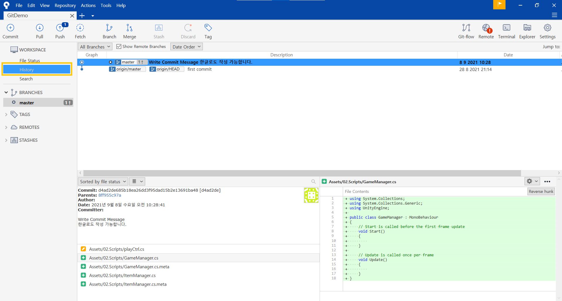 - ์ปค๋ฐ ๋ฉ์ธ์ง ์ข์ธก์ ๋ณด๋ฉด master, origin/master๋ผ๋ ์ธ๋ฑ์ค๊ฐ ์์